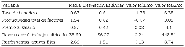 En el Cuadro 1 se observa que la tasa de beneficio muestra un valor mínimo negativo y uno máximo relativamente alto con respecto a la media, esto señala cierta disparidad entre los valores en las ramas de la industria en México. Tasas de beneficio negativas pueden significar que las empresas tuvieron ventas por debajo de los costos.