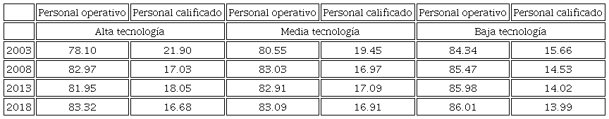 En el Cuadro 2, al desagregar los datos por grupos de ramas de baja, media y alta tecnología, se examina que los tres grupos del sector industrial mexicano operaron en mayor proporción con personal operativo. En el grupo de baja tecnología, el personal calificado en todos estos años ha disminuido, mientras que el personal menos calificado, en proporción, aumentó.