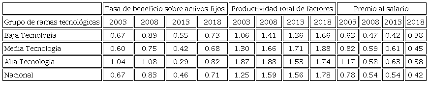 Durante el periodo, los beneficios han estado aumentando en la industria mexicana. Las ramas de alta tecnología son las que mayores beneficios económicos realizaron. Luego, le siguen las de baja tecnología, que produjeron beneficios por encima del promedio nacional, además son las que más capital por trabajador-calificado acumularon; por tanto, dichas ramas son clave en el desarrollo de la industria, aunque en general, los beneficios se vieron afectados por la Gran Recesión del 2008.