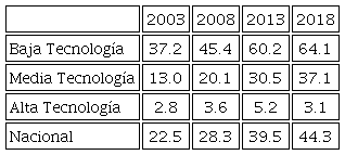 Lo mismo ocurre en el subsector de alta tecnología, el personal calificado disminuyó, mientras que el trabajo no calificado aumentó. Esto implica que el sector industrial del país en general es cada vez más empleador de trabajo no calificado. Cabe preguntarse, debido a que la industria demanda cada vez menos trabajo calificado con respecto al no calificado ¿qué relación tendrá esta disminución con los beneficios y la productividad factorial?