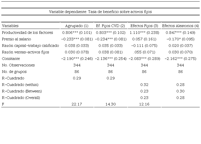 De entre los modelos de (1) al (4) se hicieron pruebas para identificar cuál de estos se ajusta mejor a los datos de la muestra. Para eso se utilizó mínimos cuadrados restringidos entre los modelos (1) y (2), encontrándose que no se rechaza la hipótesis nula al 5% de significancia, de manera que se prefiere el modelo agrupado (1) para explicar la tasa de beneficio.