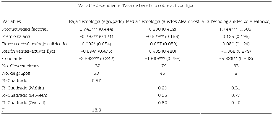Los resultados muestran para el grupo de ramas de baja tecnología, todas las variables fueron significativas, la productividad de los factores afectó positivamente la tasa de beneficio en el nivel del 1% de significancia. La relación capital fijo-trabajo calificado tiene un impacto positivo y significativo sobre los beneficios, esto muestra en promedio, que el incremento de capital por trabajador calificado aumentó los beneficios en este grupo. No obstante, el incremento porcentual, en los salarios relativos disminuyó la tasa de beneficio al nivel del 5% de significancia. Mientras, en el grupo de alta tecnología, los resultados revelan únicamente que el progreso tecnológico afectó de forma positiva los beneficios en el nivel del 1% de significancia estadística.