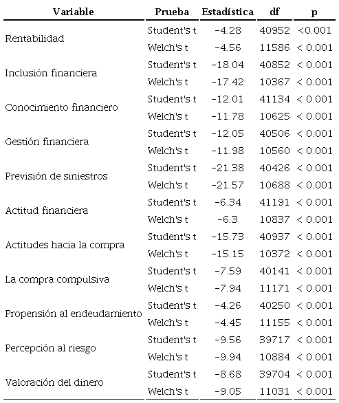 Existen diferencias entre las dos muestras, como se puede observar en el valor de p, lo que confirma que la forma de gestionar la cultura financiera es diferente en las mypes familiares versus las mypes no familiares, se encontró que en once variables hay cambios significativos, esto se puede observar en la magnitud, por lo que se rechaza la hipótesis nula (H0): las varianzas no son homogéneas. A través de la prueba de t para muestras independientes, se aprecia que el empresario de mypes no familiares gestiona diferente a las mypes familiares, por tanto, se puede concluir que la H1 se cumple y se comprueba que existen diferencias en la cultura financiera entre las mypes familiares y no familiares en América Latina.