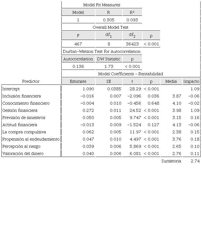 Se procede a realizar regresiones lineales para poder observar si H2: Los empresarios de las mypes familiares y no familiares le dan mayor importancia a algún elemento de la cultura financiera (rentabilidad, inclusión financiera, conocimiento financiero, gestión financiera, previsión de siniestros, actitud financiera, actitudes hacia la compra, compra compulsiva, propensión al endeudamiento, percepción al riesgo y valoración del dinero) y éste tiene un impacto en la productividad.