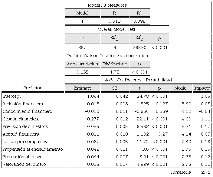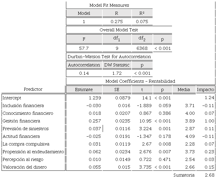 Como se puede apreciar en la regresión lineal en la columna de impacto (Tabla 5), la cultura financiera en las mypes es de 2.68, cuya escala muestra una asimetría que corre de 3.329 a 1.657. La variable gestión financiera, que es el conocimiento sobre el control de los gastos en registros escritos o electrónicos, es la variable a la cual los empresarios le dan mayor importancia y es la que tiene un mayor impacto a la productividad con 1.00 en las mypes familiares.