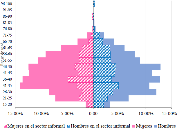 Por otra parte, la Gráfica 1 describe aún más la información objeto de estudio. Presenta una pirámide, en la que se muestran las 1582 observaciones, divididas en hombres y mujeres. Esta división se distribuye en rangos de 5 años, mostrando así el porcentaje de personas y el porcentaje de estas que trabajan en el sector informal.
