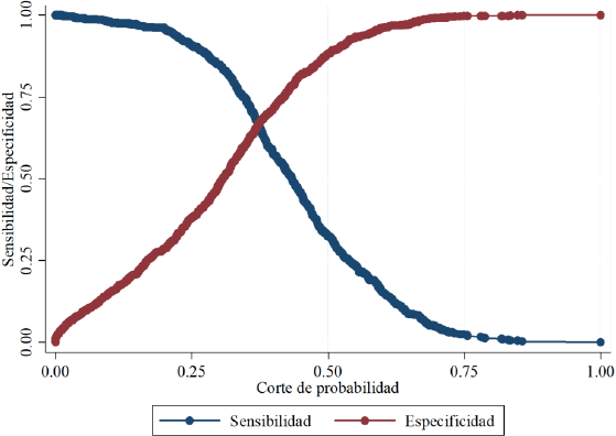 El corte de probabilidad determina la sensibilidad y especificidad del modelo. Entre mayor sea este corte, menor será la sensibilidad y mayor será la especificidad, ahora, si el corte disminuye, la sensibilidad será mayor que la especificidad (StataCorp LLC, 2019). La Gráfica 2 ayuda a visualizar el punto de corte óptimo, en el que tanto sensibilidad como especificidad son iguales.