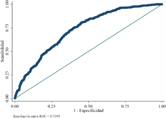Otra manera de comprobar si el modelo es correcto es a través de la curva de rendimiento diagnóstico, ROC, por sus siglas en inglés1 (vea Gráfica 3). Esta representación gráfica coloca en el eje de las abscisas a los casos predichos como falsos positivos (1-especificidad), y en el eje de las ordenadas a los verdaderos positivos (sensibilidad), ello para obtener el área bajo esta curva. Esta área puede ir desde 0.5 hasta 1, cuando ésta es una la línea diagonal; es decir, con un área de 0.5, se concluye que el modelo no sirve. Ahora bien, si el área bajo la curva se acerca a 1, se considera un buen modelo. Para este estudio se obtuvo un área de 0.7295, por lo que este modelo es aceptable (Gráfica 3).