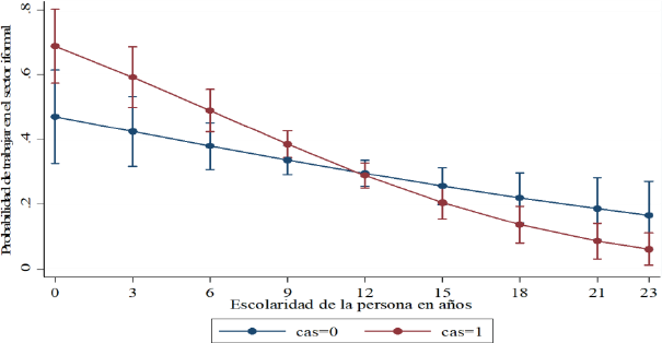 Por otra parte, los resultados que se obtienen de la interacción entre la escolaridad y el estado civil de las personas arrojan información interesante. En primer lugar, el grado de estudios sigue la misma tendencia que estudiarlo por separado; es decir, a mayor escolaridad menor probabilidad de trabajar en el sector informal. Ahora bien, cuando se le agrega el estado civil, se observa en el Cuadro 8 que una persona casada con menos de 12 años de escolaridad (es decir, hasta la secundaria aproximadamente) siempre tiene una probabilidad mayor que una persona soltera. Por otro lado, cuando una persona sobrepasa ese grado de estudios, su probabilidad se vuelve menor que la de un soltero.