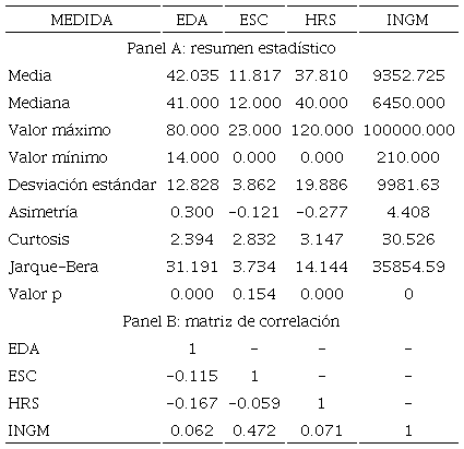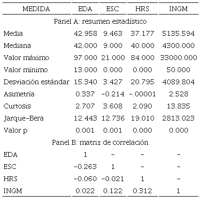 En el Cuadro 2 se aprecia la información para las personas que trabajan fuera del sector informal. En el panel A se observa que, para el caso de la asimetría de las variables, tiene el mismo comportamiento que la de las personas que trabajan en el sector informal. En cuanto a la curtosis, las variables INGM y EDA se distribuyen de la misma forma que en el Cuadro 1. La variable HRS sí tiene un cambio, ya que para los trabajadores que no laboran en el sector informal ésta se distribuye de forma leptocúrtica. La curtosis de la variable ESC no es muy cercana a cero, pero la prueba Jarque-Bera indica que se distribuye de forma normal. En el panel B se aprecia que la correlación entre las variables tiene el mismo sentido que en el Cuadro 1.