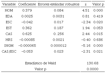 En el Cuadro 3 se presenta la estimación del modelo, se empleó el factor de expansión. Por ende, los resultados son representativos para toda la Ciudad de México. Se observa que la edad (EDA) y las horas de trabajo (HRS) no son estadísticamente significativas. Por lo que estas variables no influyen en la probabilidad de trabajar o no en el sector informal. Por otro lado, el valor p del estadístico de Wald, al ser menor a 0.05, sugiere que, en conjunto, las variables independientes son estadísticamente significativas.