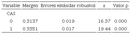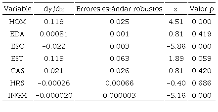 Mas allá de la significancia de cada uno de los coeficientes, para conocer el cambio marginal promedio de las probabilidades se presenta el Cuadro 4. Se observa que la escolaridad (ESC) impacta negativamente en la probabilidad de trabajar en el sector informal; es decir, por cada año de escolaridad, la probabilidad de trabajar en la informalidad disminuye .022. Asimismo, se sabe que un hombre (HOM) o una persona que estudia (EST) tiene un 0.119 más de probabilidad de trabajar en el sector informal que una mujer o una persona que no estudia. Ahora bien, si una persona se casa o vive en unión libre (CAS), tiene un 0.021 más de probabilidad de trabajar en dicho sector (note que la variable CAS no es estadísticamente significativa).