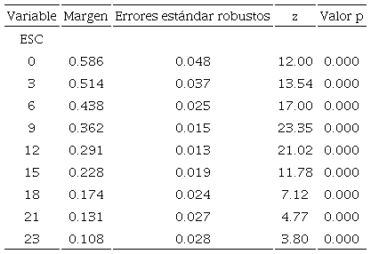 Una de las hipótesis planteadas en esta investigación propone que las personas solteras tienen una mayor probabilidad de trabajar en el sector informal. Sin embargo, de acuerdo con la información del Cuadro 6, la hipótesis no se cumple, ya que se aprecia que las personas casadas o que viven en unión libre tienen un 0.0214 más de probabilidad de estar en la informalidad. En la investigación hecha por Padilla y Reynoso (2012), realizada en la franja fronteriza de México, llegan a la misma conclusión.