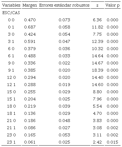 Este comportamiento es más visible en la Gráfica 4, en la que se aprecia cómo el punto de cambio para una persona casada y una soltera son precisamente los 12 años de escolaridad, Con esto, se comprueba una de las hipótesis, ya que, tanto para persona solteras como casadas, la probabilidad es la misma o parecida alrededor de los 12 años de escolaridad. Este tipo de análisis, en el que se considera la interacción entre las variables (ESC y CAS), no se encontró en las investigaciones de Hugues y Lewis (2020) y Lehmann y Zaiceva (2013) que, aunque utilizan estas dos variables, no analizan su interacción.
