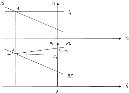 From equations (1) to (4) it can be noted that once the inflationary expectations adjust to observed inflation, and exogenous shocks become zero, in equilibrium the real interest rate will equal its natural level the output gap will be zero; and inflation will coincide with the inflation goal as with expected inflation, .