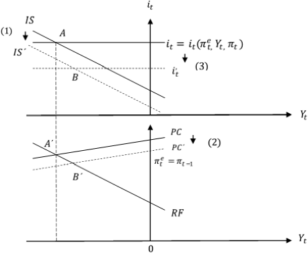 In Figure 1 output is below its potential level and inflation is lower than expected by households and producers.3 Then, diagram 2 displays how eventually inflationary expectation will diminish causing ex-ante real interest rate to rise, lowering current aggregate demand (The IS Curve shifts downwards); producers also adjust their expectations in the same direction (so the Phillips Curve, PC) shifts downwards too); Central Bank reacts lowering monetary policy rate trying to hinder aggregate´s demand contraction (Taylor Rule shifts downwards). As consequence, the economy goes from point A to B, this process will repeat until the economy reaches an equilibrium where real interest rate equals its natural level so output gap is equals zero, and observed inflation equals expected inflation and inflation target, .