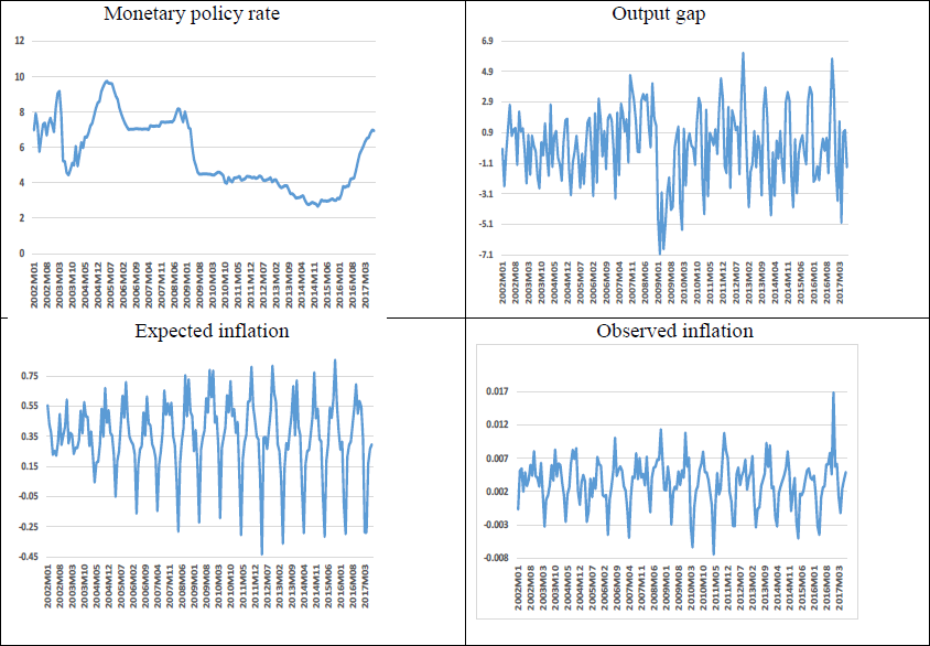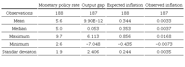 The industrial activity index (retrieved from Instituto Nacional de Estadistica y Geografía, INEGI) approximates output, and its potential level is obtained through Hodrick-Prescott filter, output gap is the difference among them. Expected inflation is current month expectations for next month´s inflation (obtained from Mexico´s Central Bank), to obtain monthly expected inflation the mean of all surveyed observations was calculated. Inflation is first difference Consumer´s Price Index (INEGI) logarithm. Finally, also retrieved from Mexico´s Central Bank, 28 days Mexican Treasury Bonds (CETES for its Spanish meaning) is the short run nominal interest rate or monetary policy rate. Table 1 shows the descriptive statistics of these mentioned variables, and the Figure 3 displays their time series.
