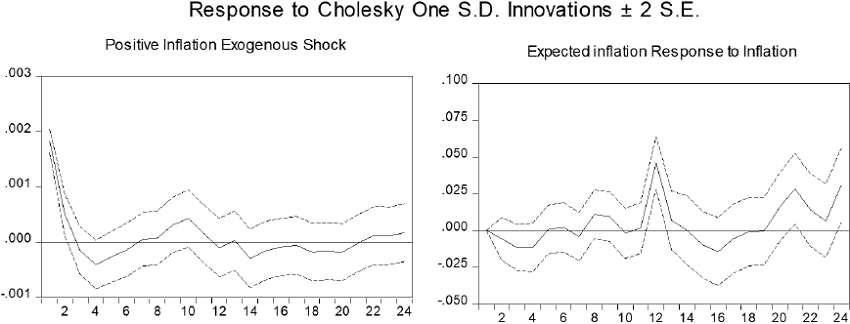 The positive inflation shock (aggregate supply shock) is statistically significant until the third month, in this lapse expected inflation does note behaves as recently observed inflation. Nevertheless, expected inflation seems to follow quite close inflation fluctuations from the fourth month until year´s one end, when expected inflations stop being statistically significant. Therefore, evidence points that expected inflation does not react to inflation in the very short run (first three months), but it does from the fourth month until the rest of the year.