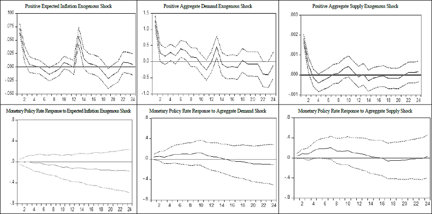 Positive aggregate demand shock is statistically significant for the first quarter, Mexico´s Central Bank answers increasing interest rate to contract aggregate demand, so producers diminish output which induce lower marginal costs and, hence, lower prices and inflation. Positive aggregate supply shock is statistically significant for the first three months, Central bank reacts increasing interest rate to lower inflation despite its contractive effects on output, after the shocks dilutes interest rate decreases. Expected inflation positive shock is statistically significant from the third to the 12th month, interest rate does not seem to increase when expectations rise, however, when expectations start decreasing interest rate declines. As well, Figure 6 points out how actual inflation respond to expected inflation almost perfectly.