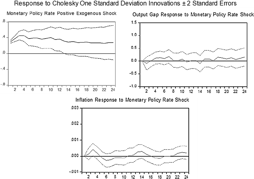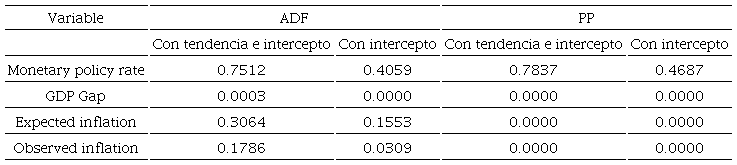 Excluding monetary policy rate, every variable seems to be stationary (Table 2), nevertheless, only the overall stationarity of the VAR is necessary to guarantee the robustness of the findings and not the stationarity of the individual variables (Cuevas, 2009; Lütkepohl, 2006).