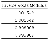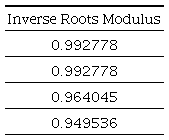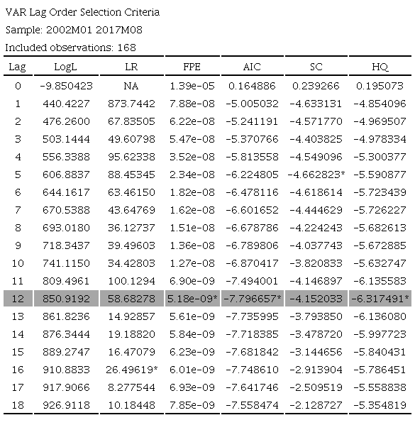 To reach an adequate VAR specification the residuals must satisfy if so an appropriate lags amount is required, if it is very small en,t may not be white noise residuals, nonetheless, if the number of lags is too big degrees of freedom will be lost, for each lag adds coefficients to the regression. The VAR also must be covariance stationary, which implies that every variable in it is stationary. To verify this, two necessary conditions are required and therefore, for a VAR to be stationary in covariance its first and second moments have to be finite and time invariant. The process is stable if the np roots of the characteristic polynomial are inside the unitary circle,4 where the characteristic polynomial is the lag polynomial determinant where is the polynomial of lags. If the VAR is stationary then it may be written as the infinite historical white noise shocks sum where matrix describes Xt time responses to each shocks sequence et .