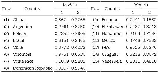Also, to avoid the potential aggregation bias obtained when empirically treating Latin American countries by panel methods (Zellner, 1962; Bacon, 1974; Lederman, Olarreaga, and Soloaga, 2009; Devadason, Chandran, and Mubarik, 2017), the empirical model is a Seemingly Unrelated Regressions (SUR) model. This model defines a system of 15 equations where the first corresponds to China and the rest to each of the 14 Latin American countries. The system presents contemporary dependence between the residuals of pairs of equations; this indicates a certain degree of interdependence between the countries that should not be ignored, according to Theil (1971) and Fiebig (2003). The application of the SUR method requires the existence of contemporaneous dependence between the study units. This estimation method integrates the variance-covariance matrix of the residuals of pairs of equations and the degrees of freedom of the entire system of equations to obtain efficiency gains (Zellner, 1962; Bacon, 1974; Greene, 1997; Wooldridge, 2002).