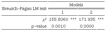 Theoretically, this existence of contemporary dependence between equations reveals that the residuals of each equation absorb non-observable factors common between countries and random shocks affecting several countries simultaneously (Theil, 1971; Fiebig, 2003). Among the non-observed factors are economic and political regulations, financial integration between countries, and factors associated with international trade, such as trade agreements, common land borders, intraregional trade, and export specialization (Mohamed and Rault, 2012; Roquez-Diaz and Escot, 2018).