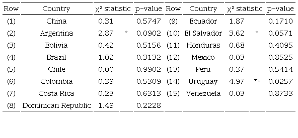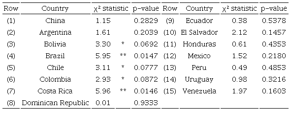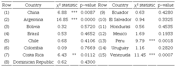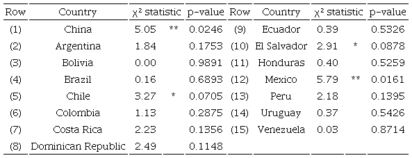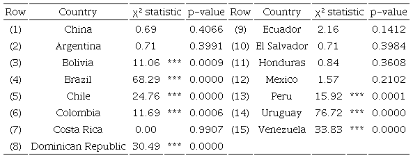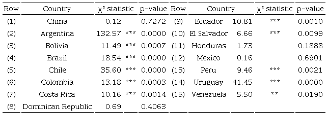 As a robustness test, a linear combination test was applied for each variable of interest whose null hypothesis is that the coefficients of the Latin American countries are equal (Appendices K and L). The results show evidence that the null hypothesis is rejected and suggests that each Latin American country reacts differently, specifically to China's presence. In addition, the existence of contemporary dependence between countries justifies using the SUR methodology as an econometric strategy to avoid problems of aggregation bias obtained when using panel treatment techniques, as noted by Zellner (1962) and Bacon (1974).