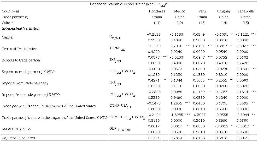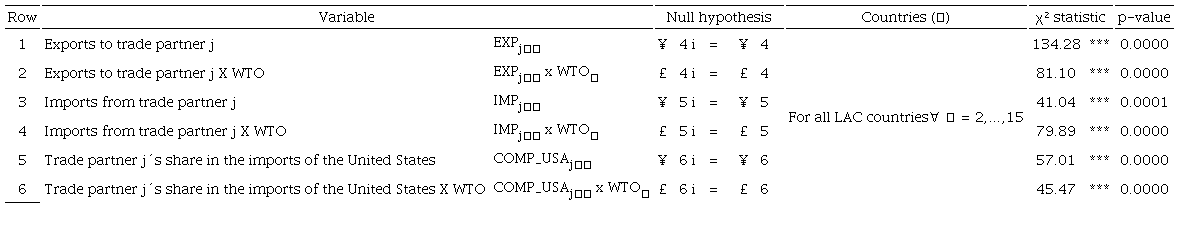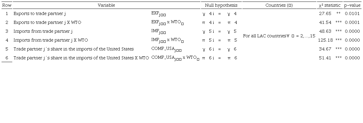 Regarding the competition effect, according to Table 3 and the linear combination test in Appendix J, in 1992 - 2000, Chinese goods in the US market positively affected the export sectors of Costa Rica, Mexico, and Venezuela. For the following period, the effect is negative in Chile, El Salvador, and Mexico and null in Costa Rica and Venezuela. It is observed that before China entered the WTO, the expansion of China's participation in global imports from the United States played a complementary role in the economic growth of the export sectors of some Latin American countries. Once China enters the WTO, this complementary effect disappears, and, in the case of Mexico, it becomes a substitution effect. On the other hand, the presence of LAC goods in the US market generates adverse effects on China's export sector before and after China's accession to the WTO.