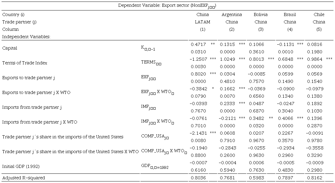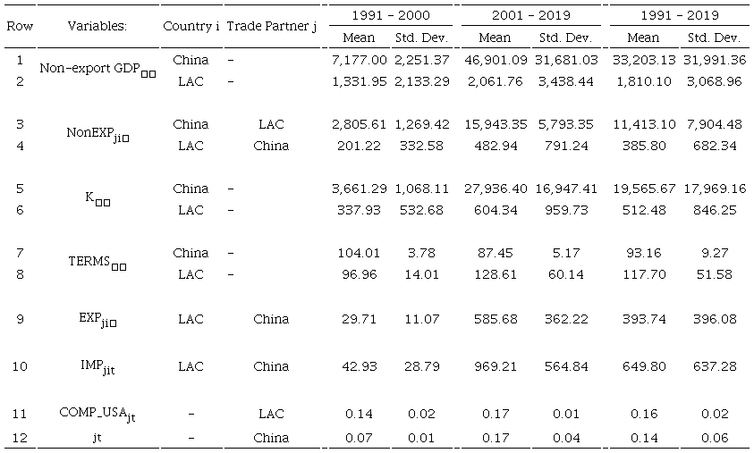 According to equation (8), for 𝑖 = Argentina and j = China, capital stock and terms of trade of Argentina, Argentina's exports to China, Argentina's imports from China, and China's share of overall US imports explain the non-export GDP of Argentina. It is applied similarly to the rest of the LAC countries. These considerations apply analogously to equation (9). On the other hand, the proposed model also analyzes the impact of trade CHN-LAC on China's economic growth. Thus, for 𝑖 = China and j = Latin America (LAC), gross capital formation and terms of trade of China, China's exports to the LAC region, China's imports from the LAC region, and Latin America's share of overall US imports explain the non-export GDP of China.