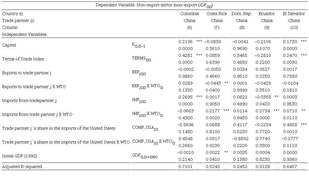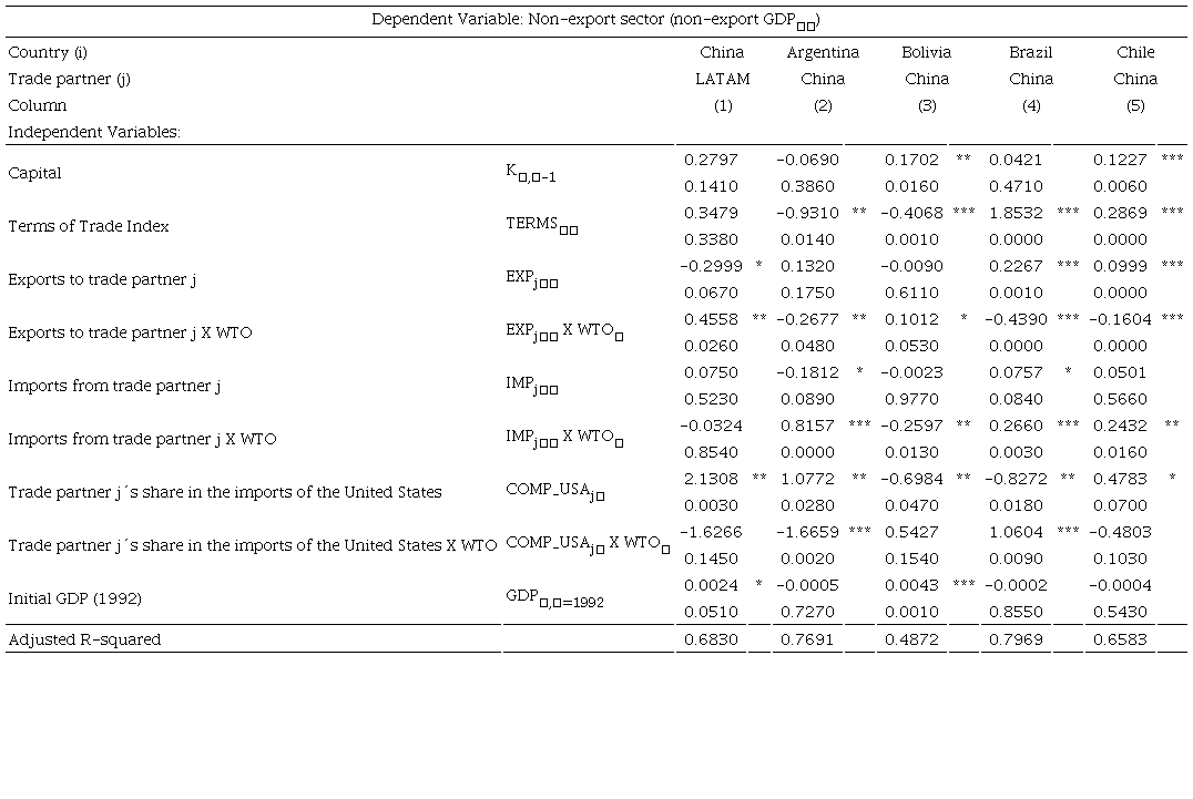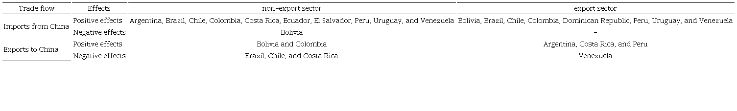 This section presents the effects of imports from China on the economic growth of each LAC country and if these effects are evident in the non-exporting or exporting sectors of each LAC country. In addition, the section shows the effects of Chinese imports from LAC on China's economic growth.