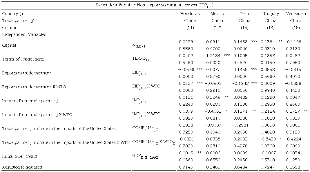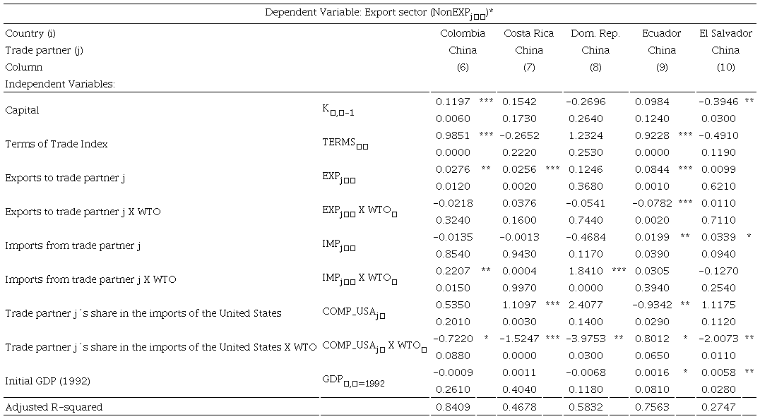 Equation (10) is the functional form used to apply the econometric analysis of the impact of trade relations between CHN-LAC on the economic growth of the non-export sector of each of these trading partners; this equation is identified as model 1 as follows: