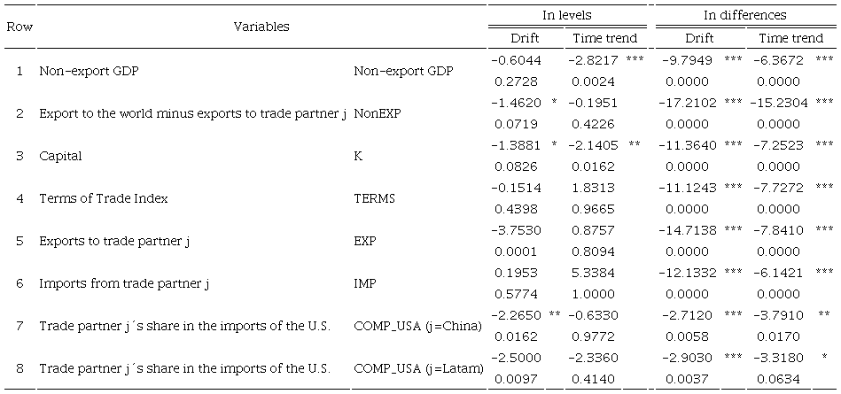 In equation 6, if 4i>0 ( 5i>0), country 𝑖 exports to trade partner j (country 𝑖 imports from trade partner j) induces economic growth of the non-export sector of country 𝑖. In equation 7, if 4i>0 ( 5i>0), country 𝑖 exports to trade partner j (country 𝑖 imports from trade partner j) boosts the economic growth of the export sector of country 𝑖. Regarding the variable COMP_USA, in equation (6), if 6i <0, the participation of the trade partner j in the US market discourages the economic growth of the non-export sector of country 𝑖; analogously applies to equation 7.
