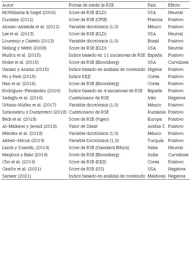 En el mercado de valores en Rumania, Simionescu y Dumitresco (2018) examinaron, empíricamente, la relación entre las prácticas de RSE y el desempeño financiero de las empresas que cotizan en la Bolsa de Valores de Bucarest. En este trabajo se analizan las políticas de RSE adoptadas por las empresas hacia seis tipos de stakeholders que influyen en el desempeño financiero. Sus resultados indican que existe un vínculo positivo entre la RSE y el desempeño financiero de las empresas cuando éstas implementan políticas de RSE con respecto a los empleados, la protección ambiental y la ética como práctica social. Además, sus hallazgos muestran que las empresas que responden al concepto de RSE, y aquellas que consideran los estándares y regulaciones internacionales para productos y servicios de calidad en su estrategia comercial, mejoran el desempeño financiero. Derivado de lo anterior, la Tabla 1 muestra algunos de los estudios que se han realizado en distintos países, con diferentes métodos de medición para la RSE y con resultados diversos.