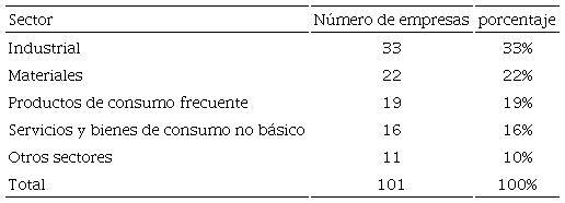 El análisis empírico se realizó con información de empresas que cotizan en la Bolsa Mexicana de Valores (BMV) y que cuentan con reportes de sustentabilidad para los años 2017-2019. Se excluye de la muestra a los bancos e instituciones financieras, debido a que su sistema contable difiere del utilizado por el resto de las empresas listadas; de incluirlas se habría provocado una falta de homogeneidad en el cálculo de los indicadores financieros como el ROA y el ROE (Cho et al., 2019; Rodríguez-Fernández, 2016). Por lo anterior, la población inicial de estudio consistió en las 145 empresas listadas en la Bolsa Mexicana de Valores, menos 27 compañías pertenecientes al sector financiero. Además, se eliminaron 17 empresas que estaban suspendidas de la BMV y que por lo tanto no contaban con información disponible al público, por lo cual la muestra final quedó compuesta por 101 empresas en total distribuidas como se muestran en la Tabla 2.