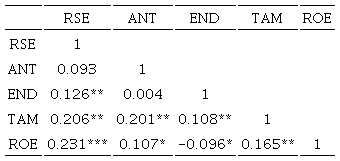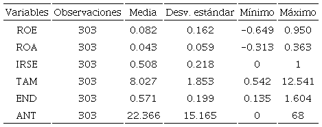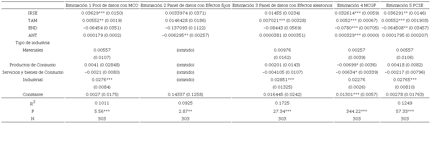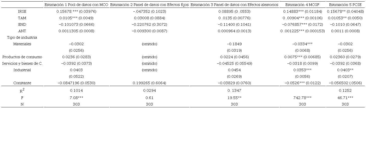 ROEit = β0+ β1IRSEit + β2INDit + β3ANTit + β4TAMit + β5ENDit + εit (modelo 1)