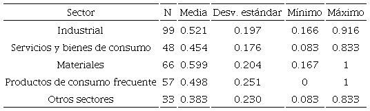 Para obtener información adicional del impacto del IRSE sobre el desempeño financiero se utilizaron algunas variables control. La primera fue el tipo de industria (IND), la cual es una variable categórica que toma los siguientes valores: 1 = Otros sectores; 2 = Materiales; 3 = Productos de consumo frecuente; 4 = Servicios y bienes de consumo; y 5 = Industrial. Se empleó para identificar el efecto que tiene el tipo de industria o sector en el desempeño financiero de las empresas listadas en la BMV. Asimismo, se empleó el logaritmo natural de las ventas totales como una variable de aproximación al tamaño de la empresa (TAM). En tercer lugar, se incluye la antigüedad de la empresa (ANT), considerando el número de años que tiene la empresa cotizando en la BMV. Por último, se calculó el nivel de endeudamiento (END) empleando la razón de las deudas totales sobre los activos totales, como han sugerido autores como Devie et al., (2018).