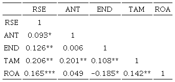 A continuación, se llevó a cabo un análisis de correlación de Pearson para identificar la asociación entre las variables de estudio y con ello, visualizar situaciones de multicolinealidad. Dado que en la presente investigación se utilizaron dos modelos para probar la hipótesis de investigación, empleando ROE y ROA como variables dependientes, la Tabla 5 y la Tabla 6 muestran los resultados de manera separada para cada uno de los modelos. Como puede observarse en ambos modelos la correlación entre la RSE y el desempeño financiero resulta positiva y significativa a un nivel de significancia de 1%. Asimismo, las variables endeudamiento (END) y tamaño de la empresa (TAM), también muestran una correlación positiva y significativa con la RSE a un nivel del 5%. Como era de esperarse, el nivel de endeudamiento resulta negativo y significativo respecto al desempeño financiero tanto con el ROE como con ROA. De igual forma, se puede observar que ninguna de las correlaciones excede el valor de 0.70 lo cual indica que no hay problemas de multicolinealidad en los modelos (Hair et al., 2005). Y la variable ANT de la empresa se correlaciona con el nivel de RSE en un nivel de significancia del 10% sólo en el modelo donde se emplea el ROA.