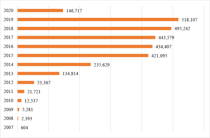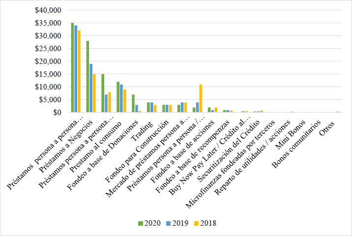 El ecosistema Fintech se conforma de varios modelos de negocios, donde predomina la presencia de los mercados de préstamos de consumo en la modalidad “persona a persona”. De acuerdo con el reporte de Cambridge Center for Alternative Finance (Ziegler et al., 2021), el volumen de operaciones de este mercado alcanzó los 3.5 billones de dólares americanos en el año 2020, encabezando la lista de modelos de negocio de finanzas alternativas durante tres años consecutivos. Este reporte muestra la actividad y el volumen de operaciones en distintas regiones como Latinoamérica y el Caribe, Norteamérica (Estados Unidos y Canadá) y Asia Pacífico, donde se encuentra que el crédito de consumo, especialmente bajo la modalidad P2P (persona a persona) es predominante frente a otros modelos de negocio. En la Figura 1 se presenta una gráfica del volumen global por modelo de negocio. Por este motivo, encontramos trascendente identificar las características que componen a los participantes de esta dinámica y las áreas de oportunidad presentes en el mercado de préstamos digitales.