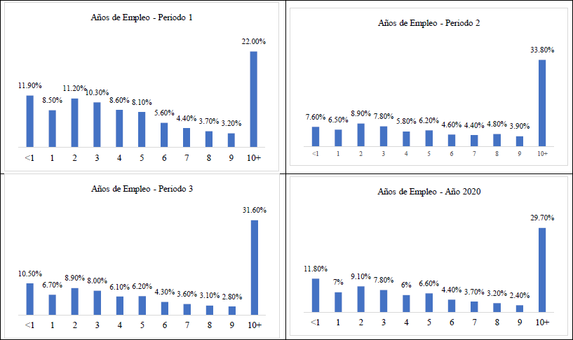 Para la variable que determina la estabilidad laboral (que hace referencia al tiempo que el prestatario ha conservado un puesto) observamos que existe una predominancia de personas que mantienen su posición con un mismo empleador por más de diez años (Figura 3). La distribución de las demás categorías de empleo es más homogénea, sin embargo, es posible identificar que, en el primer periodo, el tercer periodo y el año 2020 cuenta con un once por ciento de prestatarios que tienen menos de un año de antigüedad en su posición laboral. Respecto al riesgo, existe preferencia por clientes con mayor estabilidad laboral, y esto se ve reflejado en la base de datos de LendingClub. Se podría pensar que la cantidad de prestatarios con antigüedad mayor podría equiparar el riesgo de aquellos que presentan antigüedades menores.