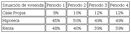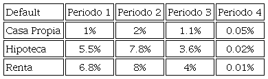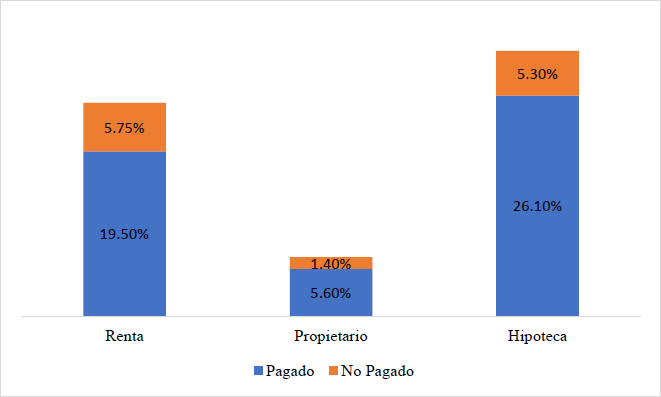 Otra variable que representa el estado socioeconómico de los participantes de la dinámica es su situación de vivienda que se divide en tres categorías. Casa propia, Hipoteca y Casa rentada. En la Tabla 3, se presenta la distribución de observaciones de acuerdo con esta variable para los periodos definidos. Se observa que existe una predominancia de prestatarios que adquirieron una hipoteca y que rentan su vivienda. Por una parte, una persona con un crédito hipotecario tiene ya una relación bancaria y, por lo tanto, información disponible respecto a su historial crediticio. Desde la perspectiva de riesgo de crédito, puede ser interesante saber cómo fue el comportamiento de pago del prestatario en función de su situación de vivienda. En la Figura 4, se presenta el porcentaje de impagos en función de la situación de vivienda para toda la base de datos.