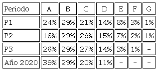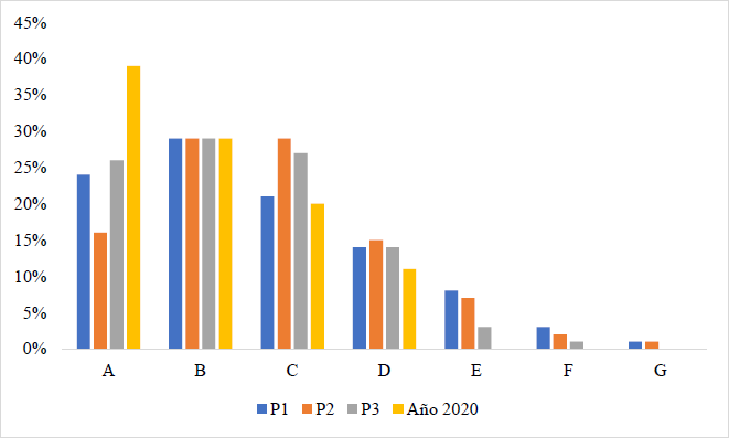 Dentro de las variables que representan la calidad o el historial crediticios de los prestatarios, se destacan dos; la calificación FICO y la calificación de riesgo asignada por LendingClub (“fico_range” y “grade” respectivamente). La variable “grade” se representa por categorías de la “A” a la “G”, donde A significa que el prestatario tiene bajo riesgo, y G indica mayor riesgo. La asignación de la tasa de interés para cada prestatario, y por lo tanto la tasa de rendimiento de los inversionistas, se realiza en función de esta calificación de riesgo más una comisión por servicio. Adicionalmente, existen cinco subcategorías por cada clasificación, representadas por la variable “sub_grade”. Únicamente el año 2020 solo presenta calificaciones de riesgo de la “A” a la “D”. En la Figura 5, se muestra la distribución de las subcategorías para la variable de calificación de riesgo, para todos los años disponibles.