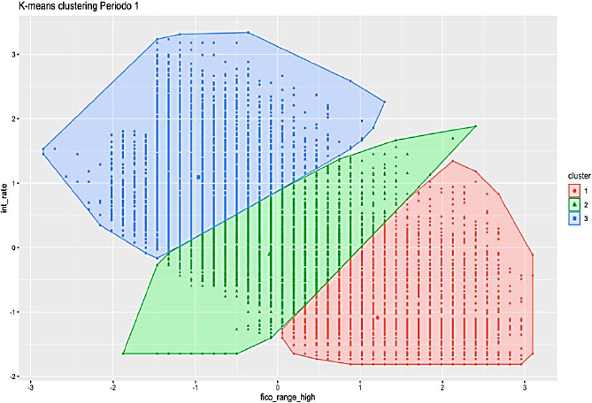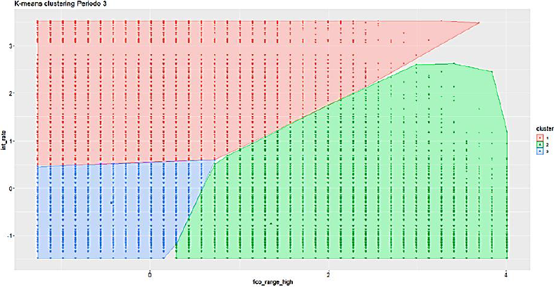 Para el periodo 3 (Figura 8), los clústeres con tasa de interés más alta y calificación FICO más baja son 1 (color rojo) y 3 (color azul). Respecto a los anteriores periodos, se observa que la calificación FICO promedio por clúster no cambia radicalmente, de todas formas, en el primer periodo los participantes tenían mejores calificaciones. Las tasas de interés en este periodo, comparada con los dos periodos anteriores, ha incrementado en menos de un punto porcentual en promedio, tal como se presenta en la Tabla 12.