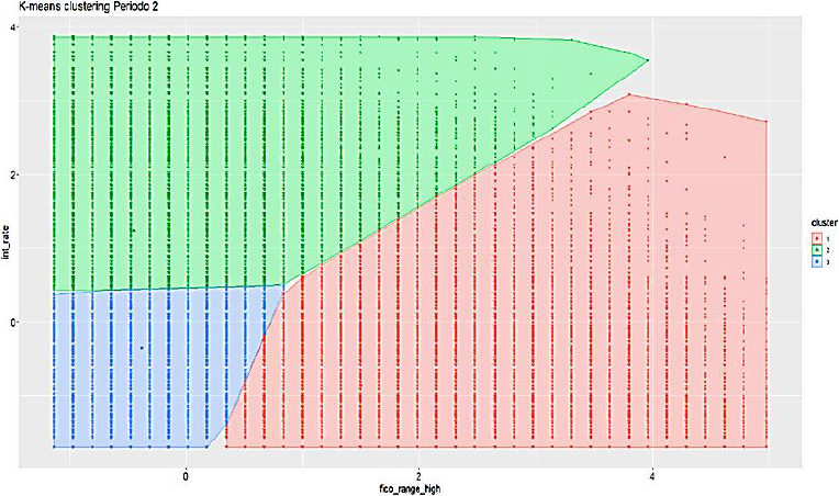 En el segundo periodo estudiado (Figura 7), el clúster número dos (color verde) recibe la tasa de interés más alta y evidentemente presenta la calificación FICO más baja, como se presenta en la Tabla 11. Gráficamente, es posible identificar que existen prestatarios que cuentan con una calificación FICO baja, que no han recibido una tasa de interés más alta como se observó en los clústeres del primer periodo, como lo demuestra el clúster número tres (color azul).