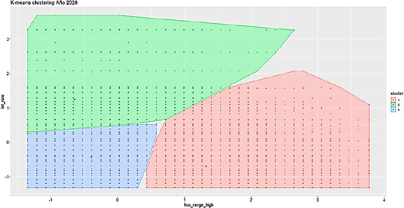 Aplicando la regla del codo definida por Dangeti, (2017) se identificó que el número óptimo de clústeres es tres para todos los periodos estudiados en este documento. De esta forma se identifica cómo se comportan las observaciones en función de las dos variables seleccionadas. Es posible observar una formación definida de las agrupaciones sin que ninguna se traslape en ningún periodo estudiado. A continuación, se presentan los resultados gráficos de este análisis junto con su interpretación.