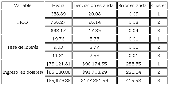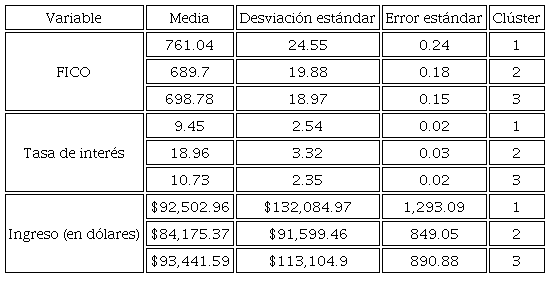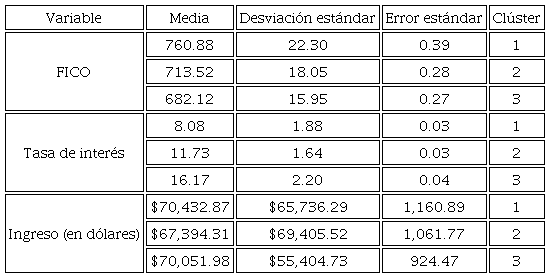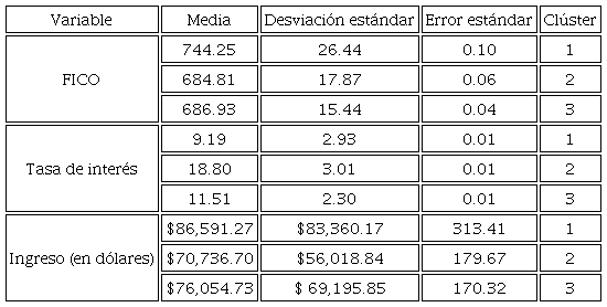 Bajo el análisis realizado, se puede recabar que las variables más importantes dentro de la base de datos de LendingClub, en una forma directa, son la tasa de interés y la calificación FICO. Con base en estas dos variables, es posible analizar a la población desde una perspectiva segmentada, mediante un análisis de clústeres. Se ha decidido utilizar estas variables porque, primeramente, la tasa de interés es una representación del riesgo inherente al crédito, en cuanto a propósito, plazo y monto. Segundo, la calificación FICO es una representación global de la calidad crediticia del prestatario, puesto que está conformada por varios elementos provenientes del historial crediticio. Mediante un análisis de clústeres tomando en cuenta estas dos variables, es posible identificar características sobre otras variables relevantes de la base de datos, como el monto del préstamo, el propósito del préstamo, y la ubicación geográfica desde donde fueron originadas. Se realizó la estandarización de los datos por la presencia de heterogeneidad entre las magnitudes de las variables estudiadas.