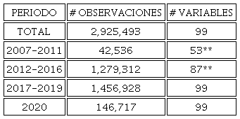 Antes de proceder con la implementación de cualquier modelo econométrico o de Machine Learning es necesario hacer un filtrado inicial de la información. Esta base de datos presenta grandes cantidades de valores faltantes para algunas variables que representan el historial crediticio de los prestatarios, en este estudio descartamos todas las variables que presenten un porcentaje de valores faltantes superior al treinta por ciento. Este argumento fundamenta la decisión de evaluar la base de datos en distintas temporalidades, de modo que sea posible aprender de la información de una forma más homogénea respecto a la influencia de las condiciones económicas sobre los usuarios de esta plataforma en cada ventana de tiempo estudiada. A continuación, en la Tabla 1, se presenta un resumen de la cantidad de observaciones y variables disponibles por periodo: