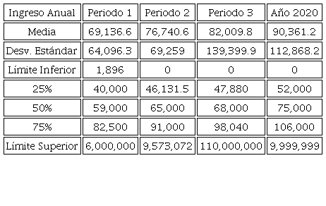 Ante esta situación se podría optar por eliminar los valores extremos de los límites superior e inferior, o utilizar otra variable que pueda contener la información del ingreso anual. En este caso, la base de datos de LendingClub presenta la variable Ratio deuda ingreso “DTI - debt to income”. Esta variable podría suplir tanto el ingreso como otras variables que representan el nivel de endeudamiento, y, por lo tanto, la calidad crediticia de cada prestatario. Sin embargo, dado que esta variable se construye utilizando el valor de ingreso reportado por cada prestatario, es necesario eliminar observaciones que presenten valores extremos en el ingreso para evitar sesgar cualquier modelo. Otra alternativa es utilizar solamente las observaciones cuyo ingreso anual haya sido verificado. Para el Periodo 1, el 50% de los ingresos son verificados, 70% en el Periodo 2, 60% en el periodo 3, y 50% en el año 2020. La eliminación del 40% de la base por la variable de ingreso anual podría representar un costo muy alto respecto a las características que generen eventos de default en un análisis de riesgo de crédito, por lo tanto, la opción más conservadora sería eliminar solamente las observaciones que sobrepasen un umbral predefinido en función de las necesidades de análisis.