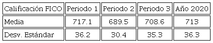 En la base de datos existen cuatro calificaciones FICO disponibles; el primer par son las calificaciones más altas y bajas del historial crediticio del prestatario al momento del inicio del préstamo, el segundo par representan la calificación más alta y baja en un periodo de consulta de la calificación FICO durante el periodo de existencia del préstamo con LendingClub. Esta calificación está desarrollada por “Fair Isaac Corporation”, y consiste en un algoritmo que define una calificación numérica dentro de un rango de 300 a 850 en función del historial crediticio disponible en burós de crédito. En este estudio se utilizará la información perteneciente a la variable “fico_range_high” considerando que esta variable es la que se evalúa al momento del inicio del préstamo. En la Tabla 5 se muestra la distribución de las calificaciones de riesgo por periodo de la base de datos de LendingClub, para la calificación FICO. En la Tabla 6, se despliega la media y desviación estándar para cada periodo de la variable mencionada.