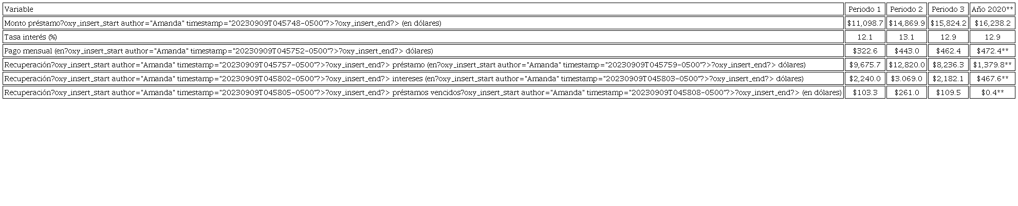 Los montos de préstamo fluctúan en un rango de $500 a $35,000 para el periodo 1, y de $1,000 a $40.000 para los periodos 2, 3 y 4. Para la tasa de interés, el rango se encuentra entre 5% y 30% para todos los periodos.